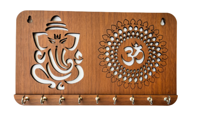 Bring devotion and elegance to your home with this beautifully crafted Ganesha Om Chakra Wooden Key Holder. Made from premium MDF wood and precision laser-cut, it features a serene Lord Ganesha design paired with an Om Chakra that adds spiritual charm. The rich wooden finish blends perfectly with modern and traditional décor. Strong metal hooks securely organize keys, keychains, and small accessories. Ideal for entrances, living rooms, offices, or as a thoughtful housewarming gift, this wall-mounted key holder combines faith, functionality, and timeless craftsmanship.